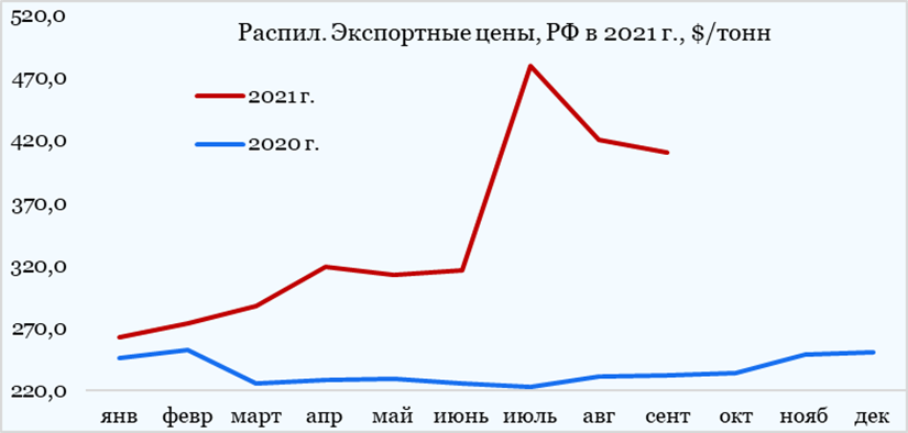 Валютная выручка от реализации пиломатериалов по итогам 9-ти мес. 2021 г. составила 4631 млн. долл., что на 40% больше, чем год назад за такой же период. Внешнеторговые средневзвешенные цены на пиломатериалы из России на конец сентября 2021 г. соответствовали уровню 410,8 $/тонну. Внешнеторговые цены на поставки распиленной древесины за период с начала года выросли на 64%. Напомним, что в 2020 г. цены на российские экспортные пиломатериалы увеличились на 9%. Тенденции по экспортным ценам на обработанные лесоматериалы в 2021 г. Диаграмма. Динамика экспортных цен на росийские пиломатериалы за последние два года