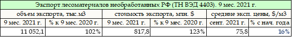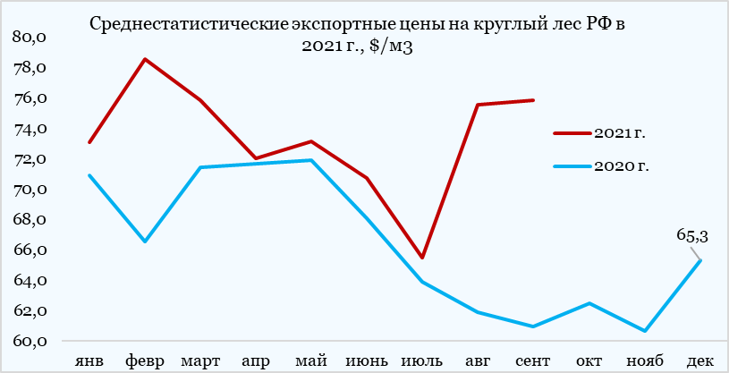 Тенденции по экспортным ценам на российский круглый лес в 2021 г. По состоянию на конец сентября 2021 г. средневзвешенные внешнеторговые цены на круглый лес из России соответствовали уровню 75,8 $/м3. За период с начала года необработанная древесина из России стала дороже на 16%. Отметим, что в августе 2021 г. по экспортным ценам на российский лес был зафиксирован скачок цен на уровне 15-ти процентов. Напомним, что в 2020 г. круглый лес из России подешевел в среднем на 4%. Важно отметить, что средние экспортные цены на древесину в круглом виде включает как более дорогой пиловочник их хвойной древесины, так и менее дорогую балансовую древесину. Динамика ценового параметра экспортных круглых лесоматериалов из России предыдущие три года характеризовалась снижением внешнеторговых цен. Напомним, что в 2018 г. круглый лес из России подешевел более чем на 9%, затем в 2019 г. экспортные цены на круглый лес упали еще на 5%. Динамика внешнеторговых цен на круглый лес см ИНФО https://www.lesonline.ru/news/?cat_id=25&n=379373 Таблица. Экспорт круглого леса. Итоги 9 мес. 2021 г.