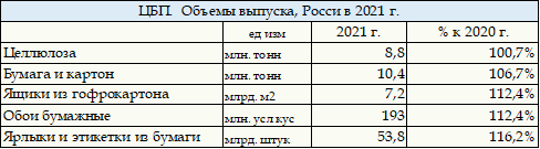 Отечественное производство фанеры восстанавливается после снижения показателей в предыдущем году. По итогам 2021 г. производство фанеры выросло на 6,8% относительно уровня 2020 г. В целом по России за 2021 г. было выпущено 4,5 млн. м3 фанеры. Напомним, что вплоть до 2017 г. производство фанеры росло умеренными темпами, ежегодно прибавляя в среднем по три процента. В 2018 г. объемы выросли почти на 7%, в 2019 г. производство фанеры увеличилось на полтора процента, в 2020 г. объёмы выпуска фанеры в целом по стране упали на 3,2%. Значительный рост в отчетном году зафиксирован на рынке древесно-волокнистых плит (ДВП; «Плиты древесноволокнистые из древесины или других одревесневших материалов», основу выпуска в данном секторе составляют плиты МДФ). За 2021 г. объемы выпуска ДВП выросли на 14,1%, составив 740 млн. усл. м2. Важно отметить, что в 2020 г. производство плит ДВП упало на 7,1%. Напомним, что в 2018 г. рост выпуска ДВП составил 8,6%, в 2019 г. производство выросло на 5%. В 2016 г. и в 2017 г. было зафиксировано увеличение выпуска ДВП почти на 10% и на 6% соответственно. Высокие темпы роста в 2021 г. демонстрирует производство древесно-стружечных плит (ДСП; «Плиты древесностружечные и аналогичные плиты из древесины или других одревесневших материалов»). В 2021 г. показатели по выпуску плит ДСП увеличились на 14,8%, составив в целом по стране 11 млн. усл. м3. Напомним, что по итогам 2020 г. был зафиксирован спад выпуска плит ДСП на уровне полутора процентов, в 2019 г. показатели увеличились на 2%, в 2018 г. производство плит ДСП выросло на 17%. Производство деревянных окон в 2021 г. понемногу восстанавливается. В 2021 г. рост выпуска по товарной группе «Окна и их коробки деревянные» составил 4,2% до уровня 475 тыс. м2. Напомним, что в 2020 г. производство деревянных окон упало почти на 15%, в 2019 г. спад составил 21%. В 2021 г. продолжают расти показатели по объемам выпуска дверей, изготовленных из древесины. За отчетный год производство деревянных дверей выросло на 17,9% до уровня 19,6 млн. м2. Показатели по объемам выпуска деревянных дверей начали расти в 2019 г., рост превысил 8%, в 2020 г. производство увеличилось еще на 1,7%. Целлюлозно-бумажная отрасль России в 2021 г. демонстрирует умеренный рост. Индекс по сектору лесной отрасли «Производство бумаги и бумажных изделий» в 2021 г. составил 109,2%, в 2020 г. индекс - 101,9%, в 2019 г. - 103,6%, в 2018 г. - 112,6%. По производству древесной целлюлозы в 2021 г. зафиксирован рост на уровне 0,7%, по выпуску бумаги и картона показатели увеличились на 6,7%. Продолжает расти производство гофрокартона и продукции из него, что продиктовано растущими потребностями розничной и оптовой торговли. Объемы выпуска тары из гофрокартона в отчетном году выросли более чем на 12%. Высокий рост зафиксирован по сектору по выпуску обоев, +16,2%. Таблица. Итоги выпуска основной продукции ЦБП в 2021 г.