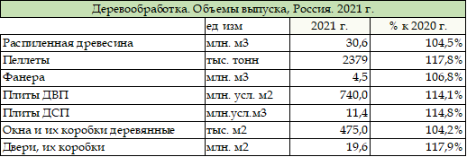 Индекс по сектору лесной отрасли «обработка древесины и производство изделий из дерева и пробки, кроме мебели, производство изделий из соломки и материалов для плетения» в 2021 г. составил 107,9%. Годом ранее данный показатель не превысил 100,2%, в 2019 г. данный показатель свыше 110%. По данным Росстата объёмы отечественного производства распиленной древесины («Лесоматериалы, продольно распиленные или расколотые, разделенные на слои или лущеные, толщиной более 6 мм; деревянные железнодорожные или трамвайные шпалы, непропитанные») по итогам 2021 г. выросли на 4,5% по отношению к уровню 2020 г., составив в целом по России около 29,9 млн. кубометров. Напомним, что показатели по уровню производства распиленной древесины растут четвертый год подряд - в 2016 г. и в 2017 г. рост по данной позиции составил 4,2% и 5,7% соответственно. В 2018 г. выпуск увеличился на 3,6%. В 2019 г. темпы роста составили 13,6%. А в 2020 г. уровень выпуска распиленной древесины в России упали на 4,4%. Динамично развивающийся сравнительно молодой сектор биоэнергетики в 2021 г. вновь демонстрирует темпы роста. В целом по России пеллет («Гранулы топливные (пеллеты) из отходов деревопереработки») было изготовлено примерно 2379 тыс. тонн, что на 17,8% больше, нежели год назад. Напомним, что в 2020 г. и в 2019 г. объемы выпуска пеллет выросли соответственно на 8,2% и 16,4%. В 2018 г. спад производства пеллет составил 1% по причине резкого сокращения производства на ООО «Выборгская целлюлоза». В 2017 г. объемы выпуска пеллет в России выросли на 30%. Таблица. Итоги выпуска основной продукции деревообработки в 2021 г.
