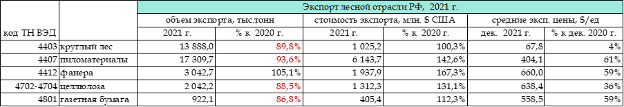 Таблица. Экспорт важнейших товарных групп Лесной промышленности в 2021 г.