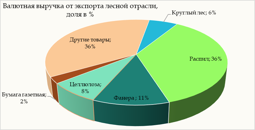Экспорт лесной промышленности, несмотря на сравнительно невысокие доходы в масштабах страны, является важным направлением внешней торговой политики государства. Доля экспортных доходов от реализации лесобумажных товаров в совокупной валютной выручке страны по итогам 2021 г. составила 3,5% (годом ранее – 3,7%). Столь невысокий показатель Леспрома России обусловлен существенными доходами от экспортных поставок топливно-энергетических ресурсов. Таблица. Распределение валютной выручки от экспорта лесо-бумажной продукции и древесины по итогам 2021 г.