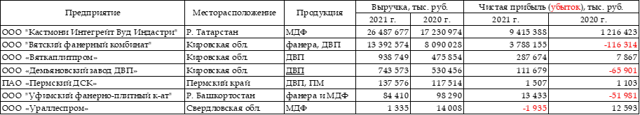 Предприятия по выпуску МДФ. Финансовые итоги 2021 г.