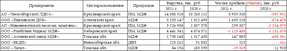 Таблица. Ключевые финансовые итоги предприятий СФО по выпуску плит ДВП и МДФ