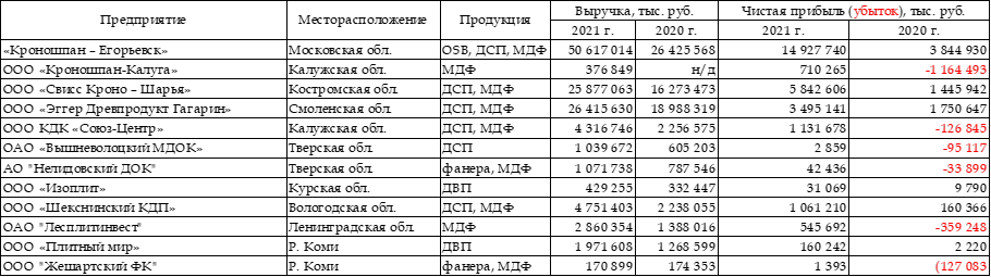 Наиболее высокие показатели по чистой прибыли в 2021 г. зафиксированы по таким заводам, как «Кроношпан – Егорьевск» - 14,9 млрд. руб.;ООО «Свисс Кроно – Шарья» - 5,8 млрд. руб.; ООО «Эггер Древпродукт Гагарин» - 3,5 млрд. руб.;ООО КДК «Союз-Центр» - 1,1 млрд. руб.; ООО «Шекснинский КДП» - 1 млрд. руб.; ООО "Кастмони Интегрейт Вуд Индастри" – 9,4 млрд. руб.; ООО "Вятский фанерный комбинат" – 3,8 млрд. руб.; АО «Лесосибирский ЛДК-1» - 3,9 млрд. руб.; ООО «Павловский ДОК» - 1,6 млрд. руб.Убытки ООО «Римбунан Хиджау МДФ» в 2021 г. составили 1,1 млрд руб.