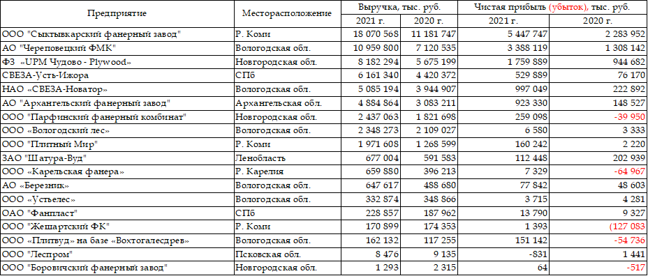 Наиболее высокие показатели по чистой прибыли в 2021 г. зафиксированы по таким заводам СЗФО, как ООО "Сыктывкарский фанерный завод" - 5,4 млрд. руб.; АО "Череповецкий ФМК" – 3,4 млрд. руб. и ФЗ «UPM Чудово - Plywood» - 1,8 млрд. руб. В списке фанерных предприятий СЗФО также отмечены финансовые итоги предприятий: НАО "СВЕЗА-Усть-Ижора", НАО «СВЕЗА-Новатор», АО "Архангельский фанерный завод", ООО "Парфинский фанерный комбинат", ООО «Вологодский лес», ООО "Плитный Мир". В списке также указаны средние и малые предприятия по выпуску фанеры и шпона, расположенные на территории СЗФО.
