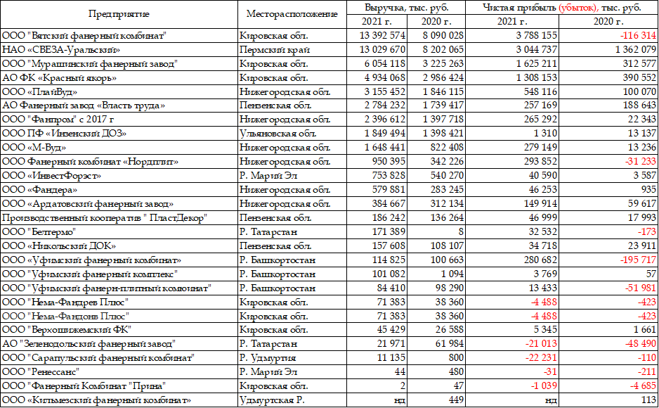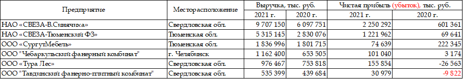 Заводы по выпуску фанеры, шпона в УФО и ПФО. Фин. итоги 2021г.