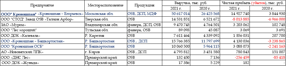 Наиболее высокие показатели по чистой прибыли в 2021 г. зафиксированы по таким заводам, как «Кроношпан – Егорьевск» - 14,9 млрд. руб.;ЗАО «Муром» - 3,2 млрд. руб; ООО ДОК «Калевала» - 1,8 млрд. руб.; ООО «Кроношпан – Башкортостан» - 4,1 млрд. руб.; ООО "Кроношпан ОСБ" – 3 млрд. руб. Убытки ООО "СТОД" Завод OSB «Талион Арбор» в 2021 г. составили 8 млрд руб.