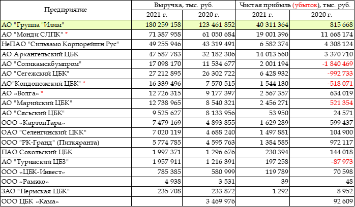 Чистая прибыль целлюлозно-бумажных предприятий по итогам 2021 г.: АО "Группа "Илим" – 40,3 млрд. руб.; АО "Монди СЛПК" – 19 млрд. руб.; НеПАО "Сильвамо Корпорейшн Рус" – 6 млрд. руб.; АО "Архангельский ЦБК" – 14 млрд. руб.; АО "Соликамскбумпром" – 2 млрд. руб.; АО "Сегежский ЦБК" – 6,4 млрд. руб.; АО «Кондопожский ЦБК» – 1,5 млрд. руб.; АО «Волга» - 2,6 млрд. руб.; АО "Марийский ЦБК" – 2,4 млрд. руб.; АО "Сясьский ЦБК" – 53,9 млн. руб.; ООО «КартонТара» - 1,6 млрд. руб.; ОАО "Селенгинский ЦКК" – 1,5 млрд. руб.; ООО "РК-Гранд" (Питкяранта) – 1,4 млрд. руб.; ОАО "Маяк" (г. Пенза) – 1,2 млрд. руб.; ООО "Сухонский КБК" – 1,9 млрд. руб.; ООО "МаякТехноцел" 1,2 млрд. руб.; ПАО Сокольский ЦБК – 231 млн. руб.; АО "Туринский ЦБЗ" – 197 млн. руб.; ООО «ЦБК-Инвест» - 119,7 млн. руб.; ООО «Рамэко» - 29 млн. руб.