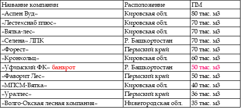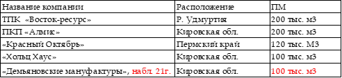 выпуска ПМ до 40 тыс. м3: «МПСМ-Вятка» (Кировская обл.),