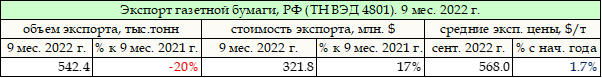 Стоимость экспорта газетной бумаги за 9 мес. 2022 г. существенно выросла относительно уровня 9 мес. 2021 г. Рост составил 17%. Валютная выручка за рассматриваемый период составила свыше 321,8 млн. долларов США. Средние экспортные цены за истекший период составили 593,3 доллара за тонну. НА конец сентября 2022 г. средние экспортные цены, по которым торговаласб российская газетная бумага, соответствовали уровню 568 долл за тонну, цены выросли более чем на полтора процента за период с начала года. 8 апреля 2022 г. вступило в силу решение FSC International о приостановке действия всех российских торговых сертификатов FSC на неопределенное время. Газетная бумага в России производится в основном из первичного волокна. Поэтому отечественная газетная бумага обладает высокими конкурентными преимуществами по сравнению с аналогичной продукцией других стран мира, где бумагу выпускают из макулатурной массы. Тем не менее в Европе в настоящее время происходит переориентация на выпуск именно вторичной, «макулатурной» бумаги. На внешних рынках продукция российских производителей конкурирует с транснациональными целлюлозно-бумажными производителями, такими как Norske Skog, Holmen, Resolute Forest Products, White Birch и другими. На внешнем рынке конкурентная борьба осуществляется также с производителями Финляндии и Канады: Norske Skog, Enso-Stora, Upm Kymmene, Abitibi Consolidated. Россия по-прежнему остается конкурентоспособным производителем газетной бумаги благодаря более низкой себестоимости производственных ресурсов. Однако сохраняется тенденция роста цен на сырье, электроэнергию, логистику, поэтому основной целью целлюлозно-бумажных предприятий России является оптимизация затрат. Предприятия – экспортёры газетной бумаги. Россия издавна выпускает газетную бумагу – история бумажного производства насчитывает почти сто лет. Экспорт газетной бумаги является традиционным для страны. Сегодня в России производством и экспортом газетной бумаги занято четыре предприятия. Это такие старейшие предприятия, как «Волга» (Нижегородская область, г. Балахна), «Монди СЛПК (Сыктывкар, Республика Коми), «Соликамскбумпром» (г. Соликамск, Пермский край). Ведущий экспортер газетной бумаги – «Карелия Папл» (Р. Карелия) - производство газетной бумаги осуществляется на производственной площадке ЦБК. В активе компании находятся логистические и лесозаготовительные ресурсы. Напомним, что в 2021 г. было объявлено, что ООО «Карелия Палп» полностью приобрела Кондопожский ЦБК. Производство газетной бумаги в России налажено только в двух регионах – в СЗФО и в ПФО. Е. Дмитриева © http://www.lesonline.ru/analitic/