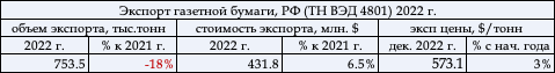 8 апреля 2022 г. вступило в силу решение FSC International о приостановке действия всех российских торговых сертификатов FSC на неопределенное время. Газетная бумага в России производится в основном из первичного волокна. Поэтому отечественная газетная бумага обладает высокими конкурентными преимуществами по сравнению с аналогичной продукцией других стран мира, где бумагу выпускают из макулатурной массы. Тем не менее в Европе в настоящее время происходит переориентация на выпуск именно вторичной, «макулатурной» бумаги. На внешних рынках продукция российских производителей конкурирует с транснациональными целлюлозно-бумажными производителями, такими как Norske Skog, Holmen, Resolute Forest Products, White Birch и другими. На внешнем рынке конкурентная борьба осуществляется также с производителями Финляндии и Канады: Norske Skog, Enso-Stora, Upm Kymmene, Abitibi Consolidated. Россия по-прежнему остается конкурентоспособным производителем газетной бумаги благодаря более низкой себестоимости производственных ресурсов. Однако сохраняется тенденция роста цен на сырье, электроэнергию, логистику, поэтому основной целью целлюлозно-бумажных предприятий России является оптимизация затрат. Предприятия – экспортёры газетной бумаги. Россия издавна выпускает газетную бумагу – история бумажного производства насчитывает почти сто лет. Экспорт газетной бумаги является традиционным для страны. Сегодня в России производством и экспортом газетной бумаги занято четыре предприятия. Это такие старейшие предприятия, как «Волга» (Нижегородская область, г. Балахна), «Монди СЛПК (Сыктывкар, Республика Коми), «Соликамскбумпром» (г. Соликамск, Пермский край). Ведущий экспортер газетной бумаги – «Карелия Папл» (Р. Карелия) - производство газетной бумаги осуществляется на производственной площадке ЦБК. В активе компании находятся логистические и лесозаготовительные ресурсы. Напомним, что в 2021 г. было объявлено, что ООО «Карелия Палп» полностью приобрела Кондопожский ЦБК. Производство газетной бумаги в России налажено только в двух регионах – в СЗФО и в ПФО.