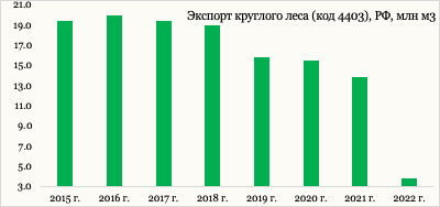 Необработанный лес — больше не товар. При этом ограничение вывоза круглых лесоматериалов сопровождается мерами поддержки со стороны государства для переориентации производств. «Наряду с мерами поддержки правительство решает задачу по ликвидации «слепых» зон, чтобы после 1 января 2022 года не было экспорта круглого леса под видом якобы обработанных материалов. Для этого была введена дифференциация лесоматериалов по влажности и степени обработки при экспорте. Экспорт бруса из хвойных и ценных лиственных пород будет после 1 января 2022 г. ограничиваться за счет заградительных экспортных таможенных пошлин. Эти меры будут способствовать сохранению ценных лесных ресурсов и выстраиванию эффективного лесного комплекса, а также созданию рабочих мест и запуску производств продукции с высокой добавленной стоимостью. Вместе с запретом на вывоз необработанного леса с 1 января 2022 г. власти ввели заградительную пошлину на часть пиломатериалов, которые часто выступают как товар прикрытия при экспорте необработанных бревен, признанных «нашим достоянием». Некоторые участники российского рынка и перевозчики, отмечая рост перевозок леса внутри страны, подчеркивают, что запрет на вывоз круглого леса являетсяэффективным инструментом для стимулирования внутренней переработки. Другие же игроки не предполагают существенный рост спроса в РФ. За год действия ограничений по вывозу из России круглого леса его поставки за рубеж ожидаемо упали примерно более чем на 70%. По итогам 2022 г. на мировые рынки было отгружено до 3,5–3,8 млн м3 круглого леса - «Лесоматериалы необработанные, с удаленной или неудаленной корой или заболонью или грубо окантованные или неокантованные» (код ТН ВЭД 4403). Диаграмма. Динамика экспорта круглого леса из России