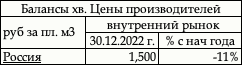Рассматривая динамику цен производителей на балансовую древесину хвойных пород, предназначенную для внутреннего рынка, отметим, что в январе 2022 г. цены выросли на 7%. Начиная с марта по май 2022 г. цены росли умеренными темпами. Летом 2022 г. на рынке л/м наблюдались ценовые качели: в июле 2022 г. цены упали на 22%. В августе зафиксирован рост цен на уровне 14%, после чего цены вновь упали на 6%. В ноябре 2022 г. снижение цен составило 5%. В декабре цены упали на 10%. Таблица. «Балансы хвойные». Средневзвешенные цены лесозаготовителей РФ