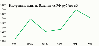 Анализируя динамику цен лесозаготовителей РФ на «Лесоматериалы круглые хвойных пород для производства целлюлозы и древесной массы (балансы)» для реализации на внутреннем рынке напомним, что в 2018 г. внутренние цены выросли на 42%, в 2019 г. было зафиксировано снижение цен на уровне 19%, в 2020 г. цены реализации балансов хвойных пород древесины внутри страны выросли на 4%. В 2020 г. рост цен составил 34%. В 2021 г. цены на балансовую древесину для российских ЦБК выросли на 34%. Диаграмма. Динамика внутренних цен на хвойные балансы за последние два года, РФ