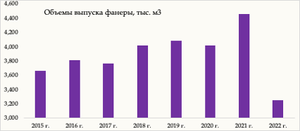 Диаграмма. Динамика выпуска фанеры в России, 2015 г. - 2022