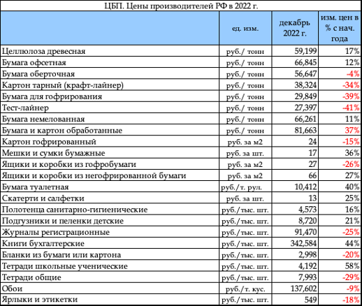 Изменение цен производителей РФ на продукцию ЦБП, реализуемую на внутреннем рынке, по состоянию на конец декабря 2022 г., изменение цен за период с начала года: «Целлюлоза древесная», цены выросли на 17%. Бумага офсетная, цены выросли на 12%. «Бумага оберточная и упаковочная», цены упали на 4%. «Картон тарный (крафт-лайнер) цены упали на 34%. «Бумага для гофрирования, цены упали на 39%. «Тест-лайнер», цены упали на41%. Бумага немелованная, цены выросли на 11%. Бумага и картон обработанные, цены выросли на 37%. «Картон гофрированный», цены упали на 15%. Мешки и сумки бумажные, цены выросли на 36%. «Ящики и коробки из гофробумаги», цены упали на 26%. «Ящики и коробки сиз негофрированной бумаги», цены выросли на 27%. «Бумага туалетная», цены выросли на 40%. «Скатерти и салфетки», цены выросли на 25%.«Полотенца СГИ», цены выросли на 16%. «Подгузники и пеленки детские», цены выросли на 21%. Тетради школьные ученические, цены выросли на 58%. Тетради общие, цены упали на 29%. Обои, цены упали на 9%. Ярлыки и этикетки, цены упали на 18%.