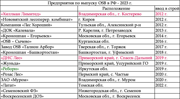 Отечественному рынку ориентированно-стружечных плит (OSB) немногим более десяти лет. Первые партии плит OSB вышли за период с 2012 г. по 2013 г. с конвейеров ДОК «Калевала», «НЛК», мини-завода «Hillman OSB» во Владимирской обл. В 2012 г. Компания «Лес Хороший» сменила профиль и открыла цех по выпуску фанеры и OSB. Крупное производство плит OSB в 2014 г. в г. Егорьевск Московской обл. ввела компания «Кроношпан». Небольшое предприятие «OSB – Сычево» в Курганской обл. было построено в 2016 г. В Тверской обл. в 2017 г. вошло в строй еще одно крупное предприятие по выпуску плит ОSB - Завод OSB «Талион Арбор». Масштабный выпуск плит OSB с 2018 г. осуществляет «Кроношпан–Башкортостан». В 2019 г. были открыты несколько предприятий по выпускуплит OSB малой мощности: В 2019 г. близ Владивостока вошел в строй Мини-завод «ДНС Лес». В 2019 г. китайские инвесторы запустили мини-завод по выпуску OSB в Приморском крае - «Жуньда». В Иркутской обл. начал работать небольшой завод - «Реборн». На ЗАО «Муром» во Владимирской обл. в 2020 г. была запущена линия по выпуску плит OSB. Запуск небольшого предприятия по выпуску плит OSB «Розас Лес» в Пермском крае был осуществлен также в 2020 г. В сентябре 2022 г. состоялось открытие завода по выпуску OSB-плит в Томской обл. - «Латат». Это первое крупное производство в Сибири. Российский рынок плит OSB ежегодно наращивает темпы роста. За десять лет на российском рынке плит OSB было открыто несколько новых производств. По состоянию на 2023 г. на российском рынке плит OSB работает шесть крупных предприятий, четыре мини-завода, а также небольшие предприятия, выпускающие домокомплекты и плиты OSB. Ранее рынок OSB в России формировался исключительно за счет импортной продукции. Производство плит OSB в стране растет высокими темпами, значительно опережая аналогичный показатель по другим древесным плитам. В 2017 г. объем потребления OSB в России впервые вышел на один уровень с потреблением фанеры. Происходит замещение фанеры низких сортов в сегменте малоэтажного строительства: в кровле, ограждающих конструкциях, обшивке стен и потолков, временных строениях.