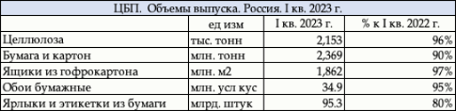 Лесная отрасль за первые три месяца 2023 г. продолжает демонстрировать снижение производственных показателей. Наибольший спад в отрасли был отмечен в секторе по деревообработке, показатели целлюлозно-бумажной индустрии за рассматриваемый период падали менее высокими темпами. Индекс производства РФ по сектору «Обработка древесины и производство изделий из дерева и пробки, кроме мебели, производство изделий из соломки и материалов для плетения» в I квартале 2023 г. составил 83,3% к аналогичному уровню предыдущего года. Индекс производства РФ по сектору «Производство бумаги и бумажных изделий» в I квартале 2023 г. составил 93,4%. В целлюлозно-бумажной отрасли в России по результатам I квартала 2023 г. отмечено снижение объемов выпуска целлюлозы, бумаги и картона, а также сокращение производства гофротары и бумажных обоев. По производству древесной целлюлозы в I квартале 2023 г. в сравнении с аналогичным периодом предыдущего года зафиксирован спад на уровне 4%, по выпуску бумаги и картона показатели уменьшились существенно - спад составил 10%. Более чем на 3% за рассматриваемый период упало производство ящиков из гофрокартона. Спад зафиксирован по сектору «обои» - выпуск сократился почти на 5%. Таблица. Итоги выпуска основной продукции ЦБП в целом по России в I квартале 2023 г.