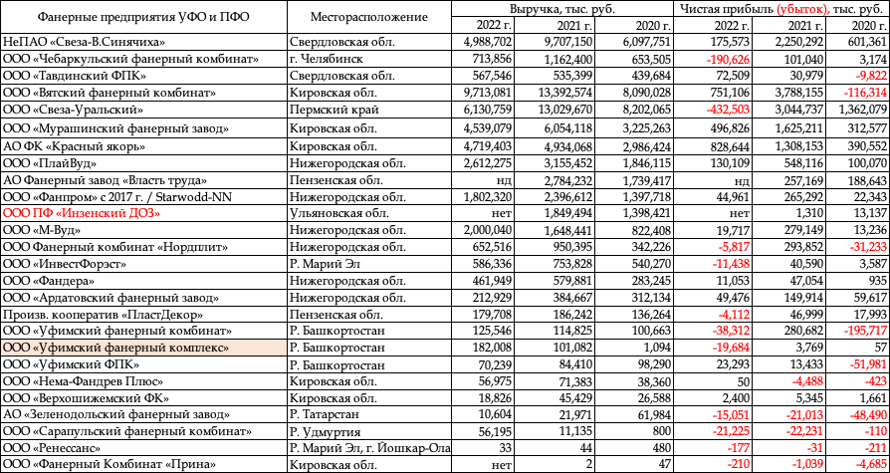 Основные виды деятельности (по ОКВЭД) указанных в таблице фанерных предприятий: «Производство шпона, фанеры, деревянных плит и панелей» (16.21) и «Производство фанеры, деревянных фанерованных панелей и аналогичных слоистых материалов, древесных плит из древесины и других одревесневших материалов» (16.21.1), Производство листов для облицовки, шпона для фанеры, производство прессованной древесины (16.21.2). Финансовые итоги предприятий представлены за 2022 г., 2021 г. и 2020 г. по объему выручки и уровню чистой прибыли (чистым убыткам) на основании официальной информации - Отчет ф.2, выполненный по РСБУ, единица изм. - тыс. руб.