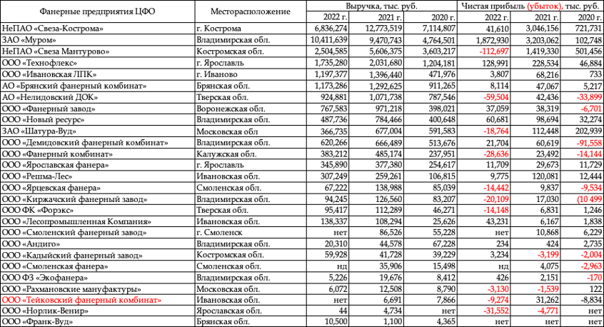 Основные виды деятельности (по ОКВЭД) указанных в таблице фанерных предприятий: «Производство шпона, фанеры, деревянных плит и панелей» (16.21) и «Производство фанеры, деревянных фанерованных панелей и аналогичных слоистых материалов, древесных плит из древесины и других одревесневших материалов» (16.21.1), Производство листов для облицовки, шпона для фанеры, производство прессованной древесины (16.21.2). Финансовые итоги предприятий представлены за 2022 г., 2021 г. и 2020 г. по объему выручки и уровню чистой прибыли (чистым убыткам) на основании официальной информации - Отчет ф.2, выполненный по РСБУ, единица изм. - тыс. руб. НеПАО «Свеза-Кострома» (г. Кострома, предприятие по выпуску ДСП, фанеры) в 2022 г. снизило выручку на 46% до 40,9 млрд руб., чистая прибыль упала существенно – с 3 млрд руб. до 41,6 млн руб.