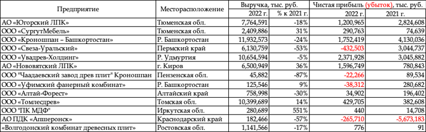 Представлены финансовые итоги предприятий России по выпуску ДСП Основные виды деятельности (по ОКВЭД) указанных в таблице предприятий: «Производство древесно-волокнистых плит из древесины или других одревесневших материалов (16.21.13)» и «Производство фанеры, деревянных фанерованных панелей и аналогичных слоистых материалов, древесных плит из древесины и других одревесневших материалов» (16.21.1). Финансовые итоги предприятий представлены за 2022 г. и 2021 г. по объему выручки и уровню чистой прибыли (чистым убыткам) на основании официальной информации - Отчет ф.2, выполненный по РСБУ, единица изм. - тыс. руб.
