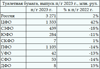 производство туалетной бумаги в ЮФО (рост 11%) и в СКФО