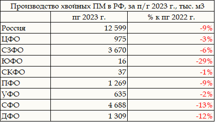 2023 г. выпуск хвойных ПМ в УФО упал на 3% г/г. В 2022
