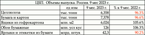 Индекс производства РФ по сектору «Производство бумаги и бумажных изделий» за 9 мес. 2023 г. составил 97,3% в аналогичному периоду предыдущего года (по итогам полугодия 2023 г. данный показатель составил 97,5%). В целлюлозно-бумажной отрасли в России по результатам девяти месяцев 2023 г. отмечено снижение объемов выпуска целлюлозы, бумаги и картона. При этом почти на 6% за рассматриваемый период выросло производство ящиков из гофрокартона, а также более чем на 6% увеличились объемы выпуска бумажных обоев. Таблица. Итоги выпуска основной продукции ЦБП в целом по России за 9 мес. 2023 г.