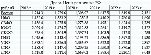 Таблица. Динамика розничных цен на Дрова 2018 г. – 2023