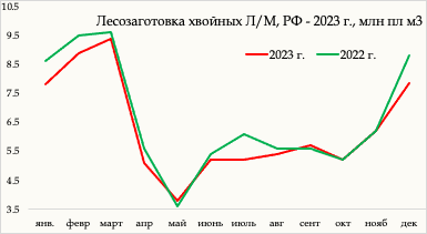 Заметим, что объемы лесозаготовки хвойной древесины в России
