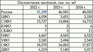 Таблица. Объёмы лесозаготовки хвойного пиловочника по ФО РФ в