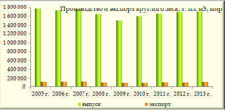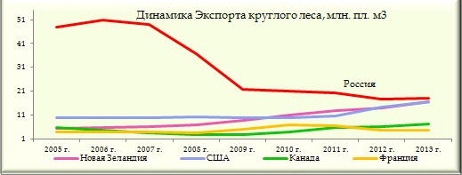 В соответствии с информаций FAOSTATа за 2013 год лидером по экспорту круглого леса выступает Россия. Всего в 2013 году Россия поставила круглого леса в натуральном выражении на мировые рынки около 17,97 млн. пл. м3. Рост за год составил 2%. Интересно отметить, что у Федеральной таможенной службы несколько иные цифры. Так по данным ФТС экспорт круглого леса в 2013 году (код ТН ВЭД 4403) составил 19,05 млн. пл. м3, а рост за год превысил 8%. Расхождение в показателях коснулось только отчетного года, ранее же цифры у FAOSTATа и ФТС совпадали. Напомним, что Россия более чем в полтора раза меньше производит круглого леса, чем США. Однако по уровню экспорта эти страны почти сравнялись лишь в 2013 году. Динамика экспорта делового леса из России напрямую отвечает мерам государства, предпринятым с целью стимулирования экспорта уже обработанной древесины. Так Правительство России с июля 2007 года поднимет вывозные таможенные пошлины на экспорт кругляка с 6,5% до 20%, а с апреля 2008 года – до 25%. Именно в этот период экспорт круглого леса из России стал резко падать. Вначале в 2008 году поставки упали на 25%, затем в 2009 году – еще на 40%. В этот период стал расти экспорт пиломатериалов, поскольку таможенные пошлины на вывоз распиленной древесины был значительно меньше. Экспортные пошлины на уровне 25% продержались вплоть до 1 сентября 2012 года, после чего – вновь стали падать. Таково было условие вступление России в ВТО. Начиная с сентября 2012 году, ставки в рамках установленных квот, упали до 13% по еловой древесине и 15% – по древесине из сосны. В этом 2012 году экспортеры спешно оформляли лицензии на получение квот – в итоге экспорт кругляка падает на 14%. Однако дальнейшее снижение пошлин до 12,7% в 2013 году дает свои плоды – экспорт кругляка вновь начал расти. Попытки Правительства установить заградительные пошлины на вывоз необработанного леса провалились. Тарифное регулирование экспорта в отношении круглого леса пока выполняется с учетом обязательств ВТО. Доля экспорта промышленного леса из РФ в суммарном объеме мировых поставок по итогам 2013 года составила 14%. Немногим меньше, а точнее 13% принадлежит Новой Зеландии. Экспорт круглого леса в этой стране последние десять лет растет ежегодно. Основной рост в динамике экспорта необработанной древесины из Новой Зеландии приходится на 2009 год – поставки леса за год выросли на треть. Рост продолжился в 2011 году, составив 18%. Затем после замедления темпов роста до 9%, экспорт кругляка из Новой Зеландии вновь стал расти и по итогам 2013 году увеличился на 21%. В результате поставщики из Новой Зеландии обогнали экспортеров из России, поставляя лес на рынки Китая. Экспорт круглого леса для Соединенных Штатов Америки только последние пять лет стал приоритетным. Так высокий рост экспорта в натуральном выражении на уровне 35% был отмечен в 2012 году. Последующий рост в 2013 году составил 16%. Так США, как и Новая Зеландия стали основными конкурентами российским экспортерам леса. Следом за США за последние пять лет наращивает объемы поставок круглого леса другая страна Северной Америки – Канада. Так, начиная с 2010 года, экспорт кругляка из Канады растет ежегодно высокими темпами. Вначале в 2010 году объёмы выросли почти на 48%, затем в 2011 году ёщё на 42%. В 2012 году рост составил 7%, а в 2013 году объёмы экспортного леса выросли на 15%.