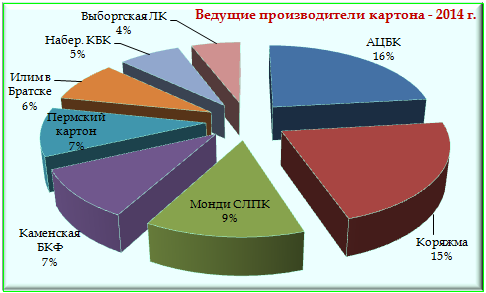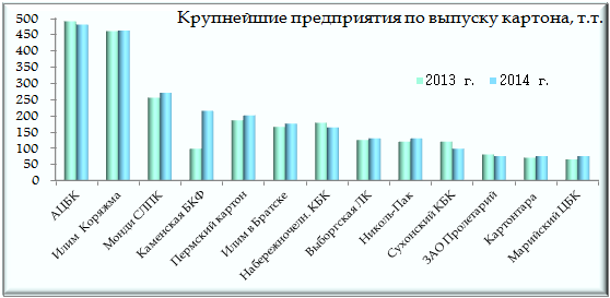 Ведущие предприятия по выпуску картона: ОАО Архангельский ЦБК, Илим в Коряжме, ОАО Монди СЛПК, АО Каменская БКФ, ООО Пермский картон, Илим в Братске, НЗАОр Набережночелнинский КБК, ООО Выборгская ЛК, ООО Николь-Пак, ООО Сухонский КБК, ЗАО Пролетарий, АО Картонтара (Майкоп), ОАО Марийский ЦБК. Изменения об'емов выпуска на этих предприятиях в 2014 г. см. http://www.lesonline.ru/analitic/?cat_id=12&id=308481 Динамика выпуска картона ведущими предприятиями в 2014 г. в сравнении с предыдущим годом представлена на диаграмме: