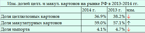 Заметим, что при производстве макулатурных картонов, наряду с целлюлозой и древмассой, применяется макулатура, причем макулатура составляет значительную весовую долю. Это удешевляет стоимость картона, но приводит к уменьшению пухлости и жесткости материала. При одинаковой поверхностной плотности, макулатурные картоны на 20 – 30 % менее жесткие, чем картоны из первичных волокон. Как правило, макулатурные картоны используются для массового производства упаковки продуктов там, где требования к снижению стоимости упаковки особенно жесткие: продукты питания (чай, кофе, пельмени), пачки для недорогих табачных изделий, коробки для стиральных порошков, лекарственных препаратов, детских игр. 3. В тоже время за последние два года увеличилось предложение товарной беленой СФА целлюлозы на рынке бумаги/картона вследствие ввода в эксплуатацию новых мощностей: • ноябрь 2014 год – новая сушильная машина на Монди Сыктывкарском ЛПК (100 тыс.тонн в год товарной хвойной СФА целлюлозы отбелка ECF); •конец 2015 года – новый целлюлозный завод в Светогорске, Белоруссия (400 тыс.тонн в год лиственной и хвойной сульфатной целлюлозы, отбелка ECF). •Ближайшие 3-4 года – новый целлюлозно-бумажный комбинат группы «Свеза» в Вологодской области. 4. Наблюдается незначительное снижение внутреннего спроса на тарные картоны на рынке РФ. Цены на рынке РФ на тарные картоны были существенно подняты. В условиях падения спроса эта мера может привести к возобновлению процесса замены целлюлозных картонов на макулатурные. Пропорция может измениться дальше, дойдя до уровня европейской (20% / 80%). 5. Импорт тарного картонов РФ понемногу растет с 2012 г., однако доля импорта снижена в 2014 г. 6. Вынужденный экспорт. Вследствие резкого изменения в декабре 2014 года курса рубля, экспорт целлюлозных тарных картонов стал выгоднее цен внутреннего рынка. Тарный картон из вторичного волокна значительно дешевле в производстве и в реализации. В результате этого на российских фабриках гофротары происходит замещение чисто-целлюлозных сортов картона на макулатурные, что заставляет производителей картона из первичного волокна перенаправлять невостребованные объемы на экспорт. Экспорт тарного картона из РФ увеличивается, хотя и небыстрыми темпами. 7. Ограничение экспорта макулатуры. В июне 2015 года Премьер-министр Дмитрий Медведев заверил подписью постановление о внесении регенерируемых бумаги и картона (макулатуры) в список товаров, очень важных для российского рынка. Область применения регенерируемых бумаги и картона широчайшая. Их используют для производства упаковок, одноразовой посуды, стройматериалов, офисной бумаги и прочего. Цена на сырье более 50% себестоимости продукции. Согласно данным, в 2014 году около 2,25 миллионов тонн составил объем собранной макулатуры, а его экспорт из России превышает 350-400 тысяч тонн в год, что составляет примерно $65-75 миллионов. 8. Еще одна тендеция, характерная для предприятий ЛПК, связанная с общей экономической ситуацией в стране - падение покупательской способности населения и отсутствие доступных кредитов для промышленности приводит к нарастанию кризиса неплатежей в РФ. Следствием этого будет рост количества неплательщиков с зависшей дебиторской задолженностью, массовых банкротств среди покупателей целлюлозы, тарных картонов, гофроупаковки, белых б