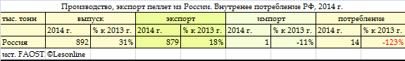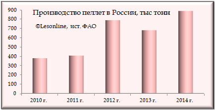 Производство древесных пеллет в России в 2014 г. выросло на треть. Для России производство пеллет – молодое. Буквально в 2011 году крупная «Выборгская лесопромышленная корпорация» («ВЛК», ранее «Выборгская целлюлоза») начала производство древесных гранул для реализации их, прежде всего, в Швеции и Дании. По итогам 2014 года Россия стоит на восьмом месте в мире среди стран, выпускающих возобновляемое древесное биотопливо (WoodPellets), занимая долю 3% мирового производства.