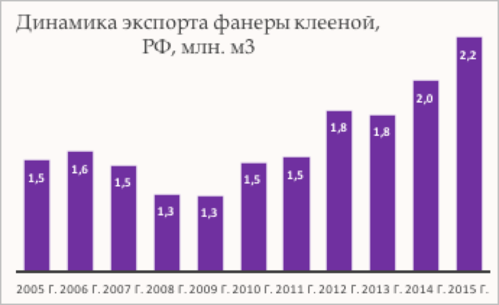 Важно отметить, что экспорт отечественной клееной фанеры в 2015 году рос опережающими темпами относительно выпуска фанеры в России. Так темпы роста выпуска фанеры по итогам 2015 года замедлились и составили всего 1,6%, при этом экспортные поставки увеличились на 12%. На экспорт в отчетном году было поставлено 61% от российского выпуска клееной фанеры (годом ранее 56%).
