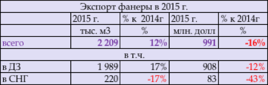 За отчетный год стоимость экспорта фанеры в целом по России составила 990,9 млн. долл., что на 15.5% меньше, чем год назад. Важно отметить, что валютная выручка от экспорта фанеры в 2015 году в отличии от роста физических объемов показала отрицательную динамику – данная тенденция была вызвана существенным удешевлением российской фанеры на внешнем рынке.