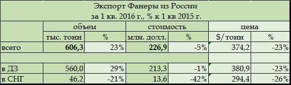 По итогам I квартала 2016 года в сравнении с I кварталом 2015 года экспорт фанеры вырос на 23%. Всего по итогам первых трех месяцев 2016 года на внешние рынки, согласно информации ФТС было отгружено около 606,3 тыс. м3 фанеры. Экспортная фанера из России в долларовом выражении вновь подешевела. Средние таможенные цены на клееную фанеру из России по итогам I квартала 2016 года с начала года упали на 17%, составив в среднем 374,2 $/м3. По отношению к уровню цен I квартала 2015 года отмечен спад на уровне 23%. Напомним, что в 2015 году российская фанера на мировых рынках подешевела на четверть - обвал цен в долларовом выражении оказался существенным. Для российских экспортеров данное обстоятельство компенсировалось, разве что, стремительно растущим курсом валют за истекшие два года. Напомним, что внешнеторговые цены на клееную фанеру, экспортируемую из России в 2015 году показали спад на уровне 25%, составив в среднем 448,6 $/м3.