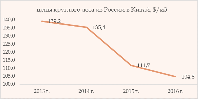 Средние статистические экспортные цены России на отгруженный в Китай деловой круглый лес последние пять лет демонстрируют нисходящую динамику. Буквально обвал цен был зафиксирован в 2015 году – за год внешнеторговые цены на российскую древесину упали почти на 18%. В 2015 году снижение спроса в Китае, как на сырую древесину, так и продукцию переработки произошло вследствие переизбытка на китайском рынке лесопродукции, ввезенной не только из России, но и из Канады, США, Новой Зеландии. В результате стоимость леса опустилась до минимума за многие годы. "За последние десять лет мы столкнулись с самой низкой ценой в Японии и Китае", - отмечали лесоэкспортеры необработанной древесины. В 2016 году спад продолжился, составив 6% - цены упали до 104,8 $ за кубометр круглого леса. Поставляя на рынки Китая более дешевую лесопродукцию, российским экспортерам удалось оттеснить своих конкурентов. При этом слабый рубль позволил российским предпринимателям компенсировать упущенную выгоду по стоимости, так как валютная выручка от экспорта исчисляется в долларовом выражении. С учетом дефляционных тенденций на рынке КНР, рост импортных цен на круглый лес в краткосрочной перспективе представляется маловероятным.