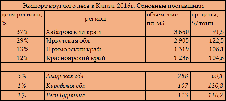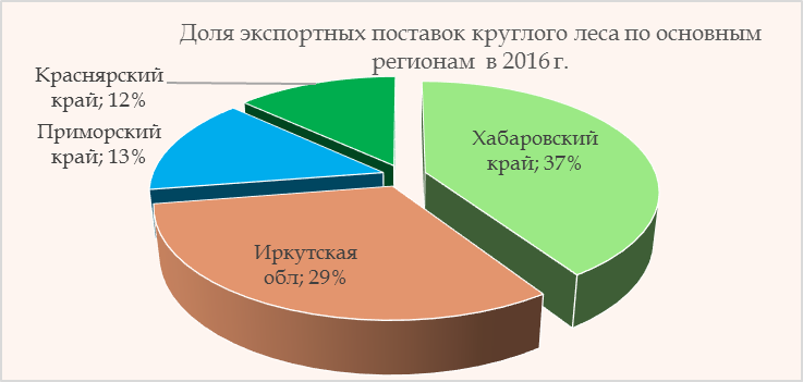 Хабаровский край является крупнейшим лесным регионом России. В крае, как и на Дальнем Востоке в целом, основное лесопользование связано с заготовкой древесины. Наиболее распространенными древесными породами на территории Хабаровского края являются ель, лиственница, сосна. Большая часть покрытой лесом площади края занята хвойными породами. В подавляющем большинстве предприятия лесопромышленного комплекса Хабаровского края экспортируют лесоматериалы, и по большей части круглый лес и пиломатериалы. Ванинская таможня занимает второе место по объему экспорта лесоматериалов в регионе деятельности Дальневосточного таможенного управления. Наибольшие объемы экспорта необработанных круглых лесоматериалов в регионе деятельности Ванинской таможни оформляются на таможенном посту Морской порт Ванино. Вторым регионом по объемам поставок необработанной древесины на рынки Китая выступает Иркутская область – доля экспорта 29%. Всего в 2016 году предприятия Иркутской области отгрузили в Поднебесную около 2905 тыс. пл. м3 по средней цене 122,5 $/м3 круглого леса. Интересно отметить, что двумя годами ранее лидером по экспорту круглого леса выступала Иркутская область – доля поставок составляла 38%, при этом из Хабаровского края было отправлено 32% поставок.