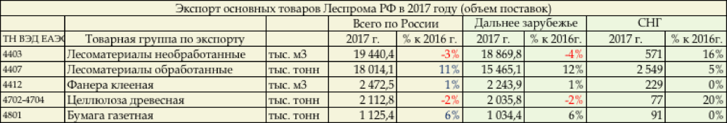 Отмечая итоги экспорта лесобумажной продукции в 2017 году в целом по России, необходимо сказать, что увеличение объемов отгруженной продукции был зафиксирован в первую очередь по распиленной древесине. Выросли за год и поставки на мировые рынки отечественной газетной бумаги. По экспорту фанеры в 2017 году рост был невысоким. В тоже время в 2017 году сократился экспорт круглых лесоматериалов и древесной целлюлозы.