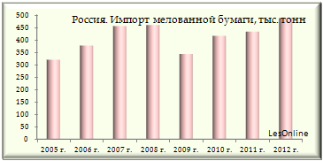 В результате импорт меловки в Россию только за 2006 год увеличился на 18%, в следующем году поставки выросли еще на 21%. Рост импорта мелованных бумаг был прерван глобальным мировым кризисом. Только за 2009 год поставки мелованной бумаги в Россию упали на четверть. Однако уже в 2010 году импорт мелованной бумаги был восстановлен, а уже в 2012 году объемы поставок превышали докризисные. Только в 2012 году ввоз меловки в нашу страну вырос на 12%. В Россию импортируется порядка 450 тысяч тонн мелованной бумаги и 400 тысяч тонн мелованного картона в год.см.http://www.lesonline.ru/analitic/?cat_id=12&id=240045. Либеральный режим ввода импортной пошлины на ввоз мелованной бумаги в размере 5-ти процентов был продлен на срок до конца 2013 года. Однако в июле 2012 года ЕЭК вновь утвердила новую ставку на ввоз мелованных бумаг и картона на уровне 15%. Напомним, что ранее, еще в 1995 году для создания благоприятных условий отечественного выпуска мелованной бумаги, правительство ввело 15%-ю импортную пошлину, которая действовала вплоть до 2006 года. Однако, несмотря на усилия правительства по увеличению пошлины так и не привели к появлению мелованной бумаги российского производства. Правда, до 2010 года мелованную бумагу в небольших количествах выпускали такие предприятия, как Выборгский ЦБК и Сыктывкарский ЛПК, Санкт-Петербургская бумажная фабрика Гознака и Московская фабрика технических бумаг "Октябрь". Но объем выпуска мелованной бумаги падал из года в год: так если в 2000 году выпуск меловки составлял около 2 тыс. тонн, то в 2009-м — всего 942 тонны. Единственный отечественный производитель, ФГУП Гознака исторически выпускает около 1 тыс. тонн мелованной продукции. Вообще производство мелованной бумаги в России прекратилось в 2010 году, когда, по данным Росстата, было выпущено всего 4 тонны этой продукции.