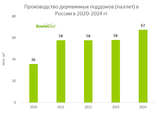Деревянные паллеты значительно оптимизируют логистические процессы. По данным «Анализа рынка деревянных поддонов (паллет) в России», подготовленного BusinesStat в 2025 г, в 2020-2024 гг их производство в стране увеличилось на 88%: с 36 до 67 млн шт.