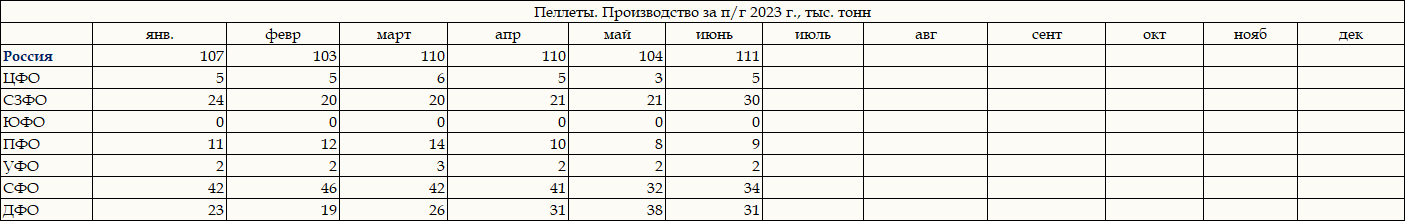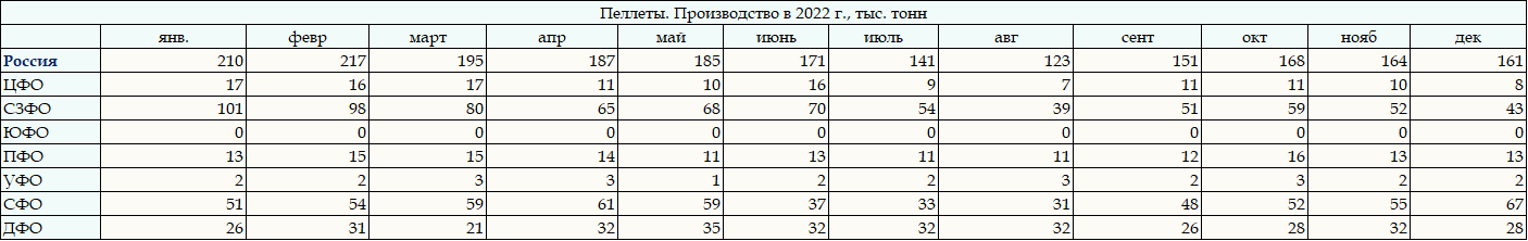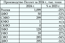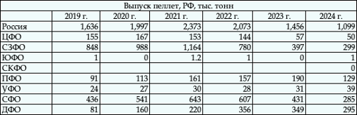 Таблица. Выпуск пеллет по федеральным округам России в 2024