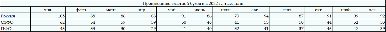 Таблица. Объемы выпуска «Газетной бумаги» в целом по России и по ФО