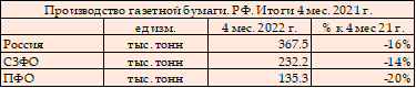 Выпуск газетной бумаги. 4 мес. 2022 г.