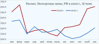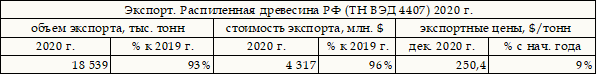 Несмотря на снижение экспорта распиленной древесины за первые пять месяцев 2020 г. в сравнении с аналогичным периодом предыдущего года, экспортные цены России упали незначительно. Более того, в январе 2020 г. в период начала падемии в Китае цены на распил выросли по отношению к январю 2019 г. почти на 4%, в феврале рост цен составил 6%. Последующие месяцы было зафиксировано незначительное колебание цен. По состоянию на июнь 2020 года внешнеторговые цены на российские пиломатериалы составили в среднем 225,3 $/тонну, за период с начала года цены упали на 2,3%.