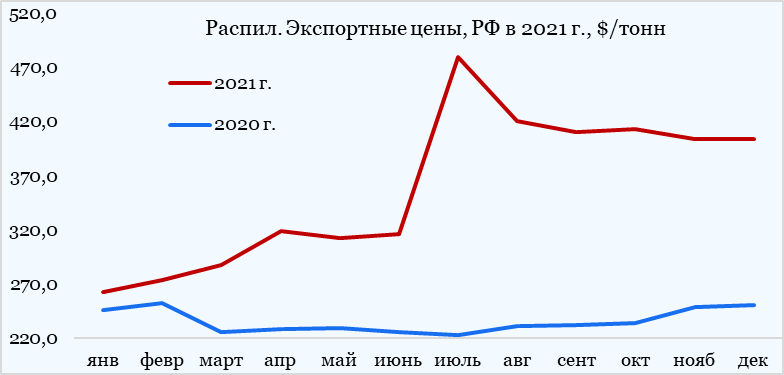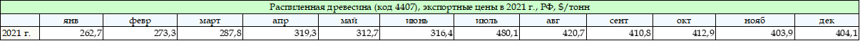 Средневзвешенные цены на экспортные поставки распиленной древесины (код ТНВЭД 4407), $/тонну. Итоги  2021 г.