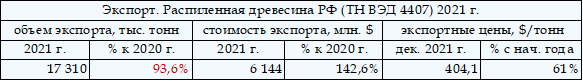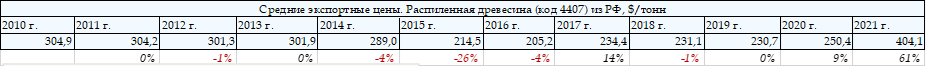 Таблица. Динамика экспортных цен на пиломатериалы в течение 2021 г.